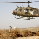 The Louisiana Army National Guard has a ground crew and an air crew. The ground crew prepares for the helicopter to fly down low enough to attach a harness to the bottom of the helicopter. The air crew drives the helicopter and airlifts the harnessed bundles.