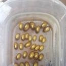 Louisiana Pearlshell mussels with freshly glued, yellow, Hallprint or PIT tags. Pit tags are covered sealed with gray marine epoxy to increase retention. These tags provide a unique identification for each individual, each presenting an different advantage. HallPrint tags are labeled directly on the shell and can be easily read while PIT tags need a special reader but can be detected without seeing or handling the mussel.