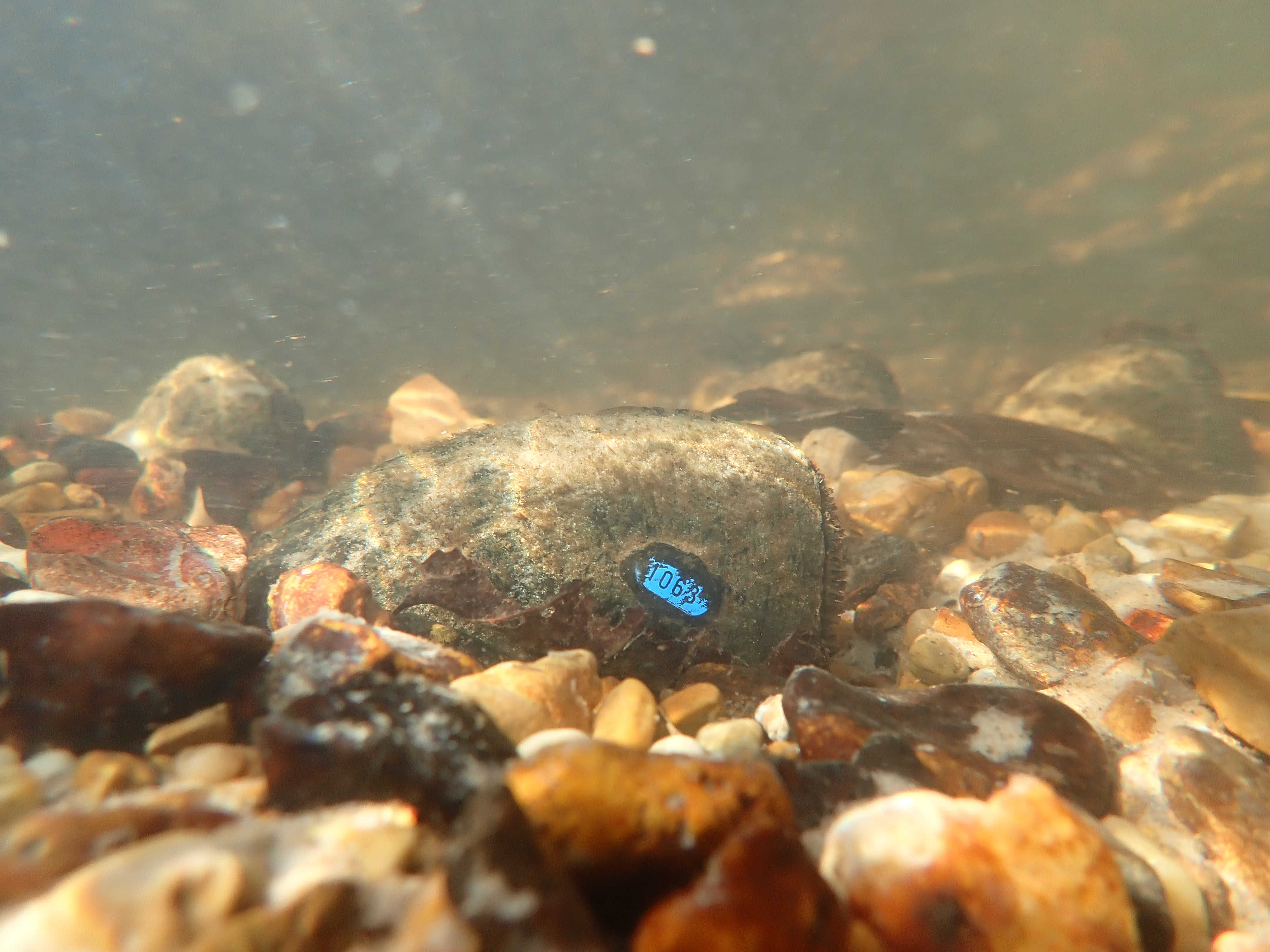 An adult Louisiana Pearshell, marked with a blue HallPrint tag, blending into the rocky creek bottom.