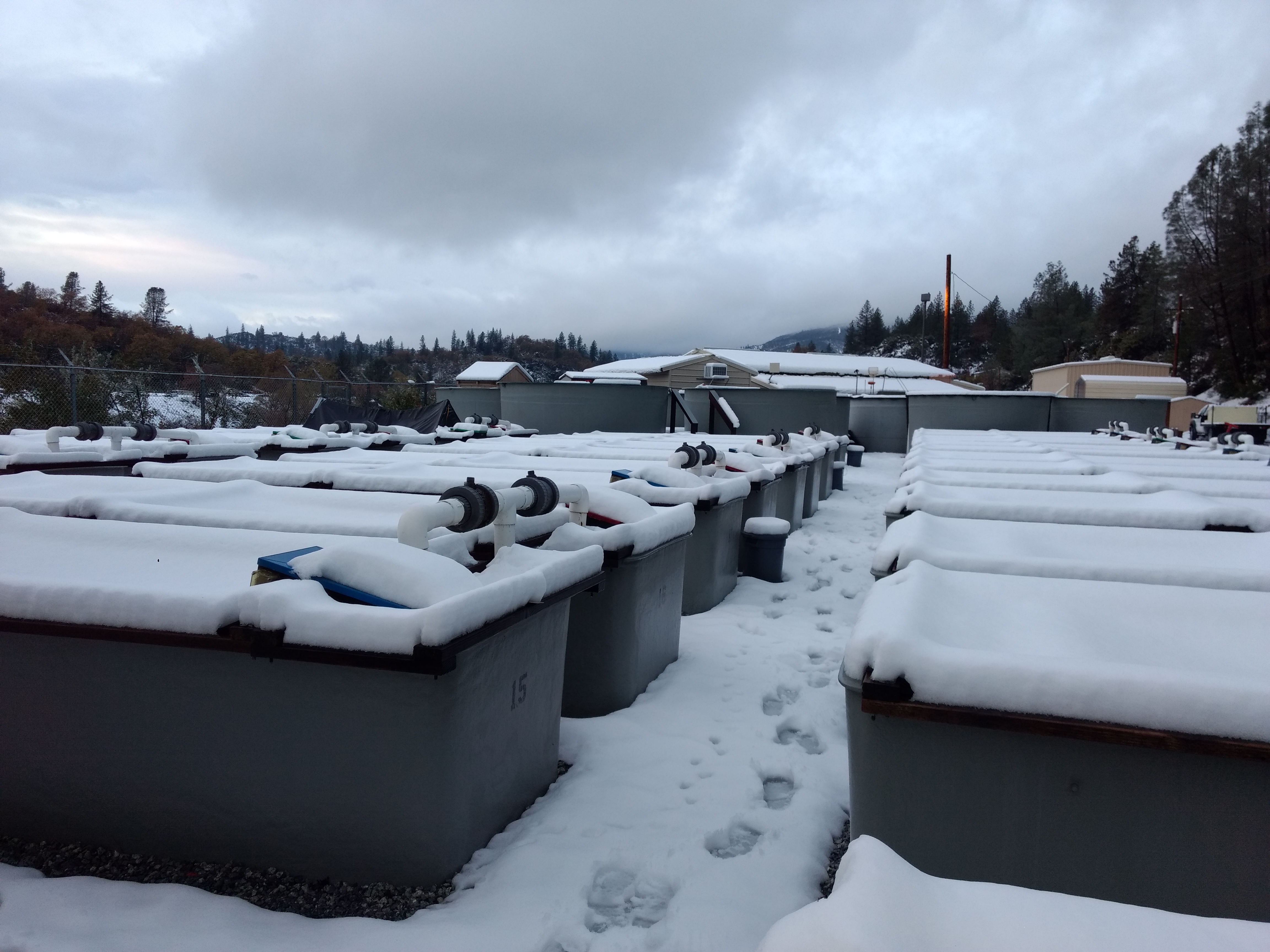A rare snow fell at Livingston Stone NFH and covered the outdoor rearing tanks.