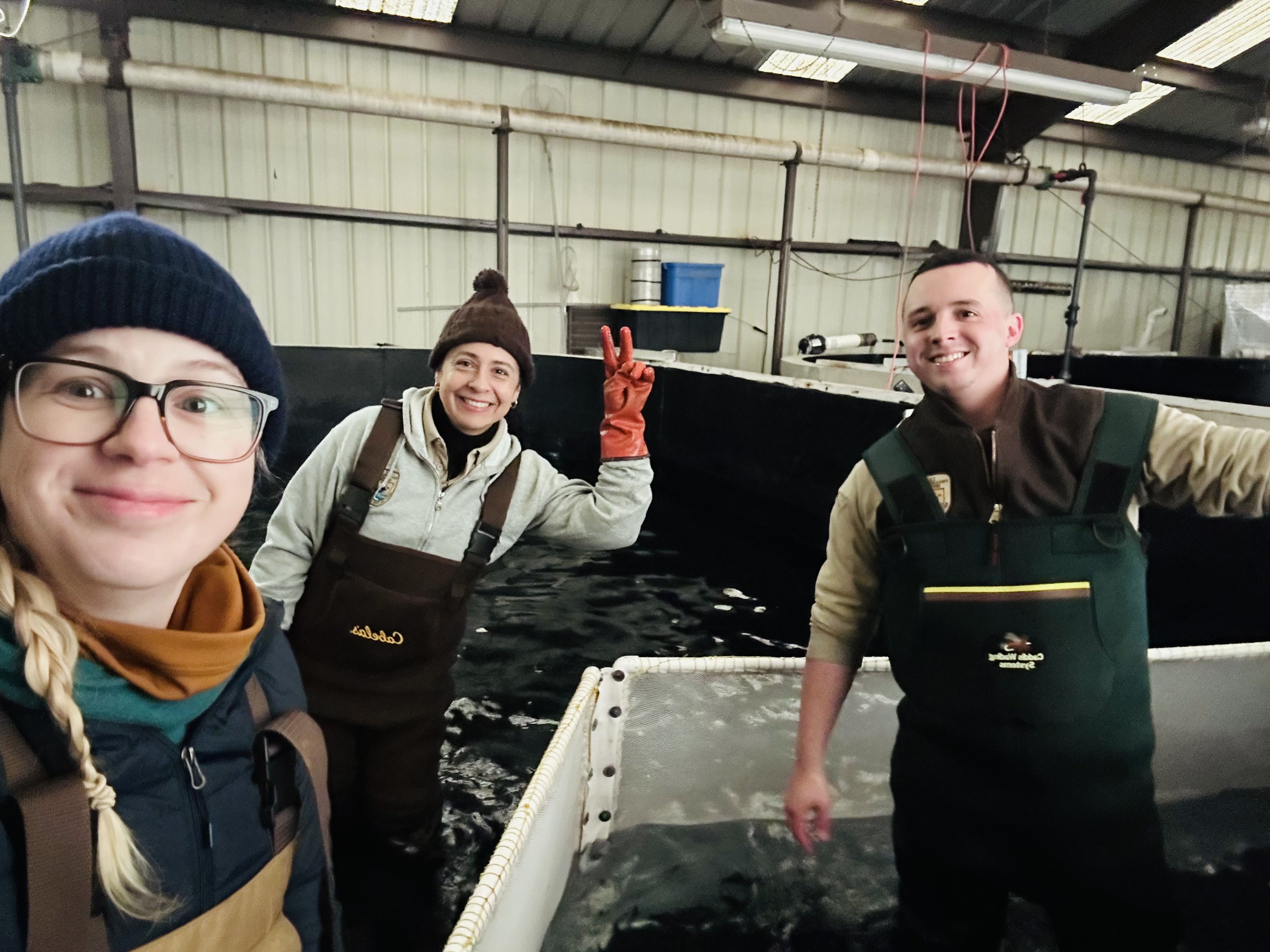 Volunteer Maeve Ahern poses with biologists at Nashua National Fish Hatchery.