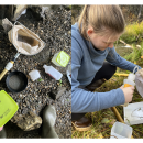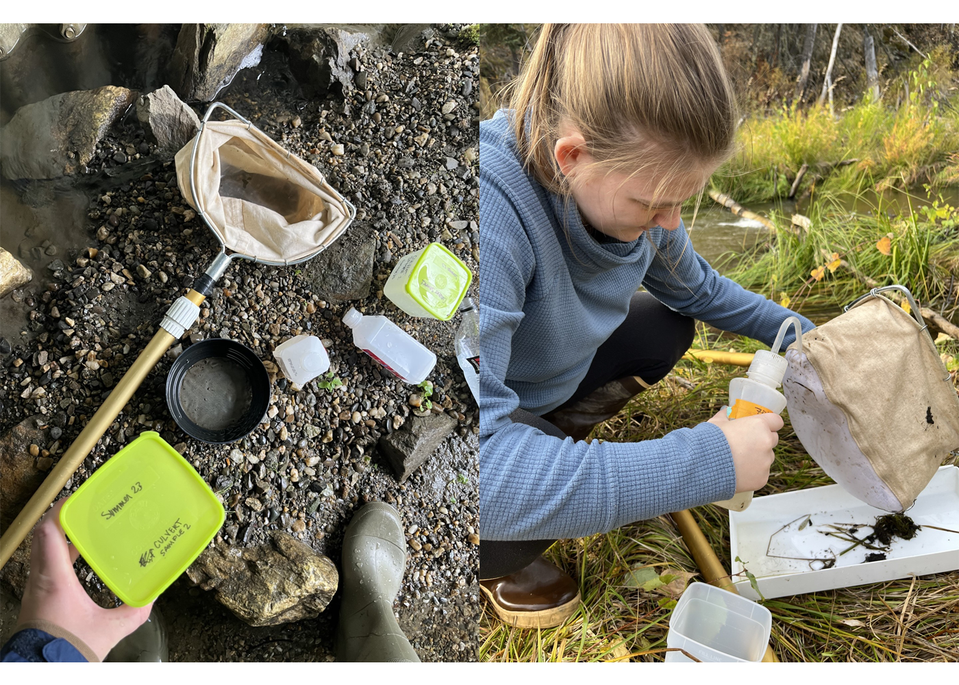 Left: Tools used to collect macroinvertebrates from Cripple Creek. Right: Maggie House squats on the banks of Cripple Creek as she identifies macroinvertebrates caught in her kick net. Photos courtesy of Maggie House.