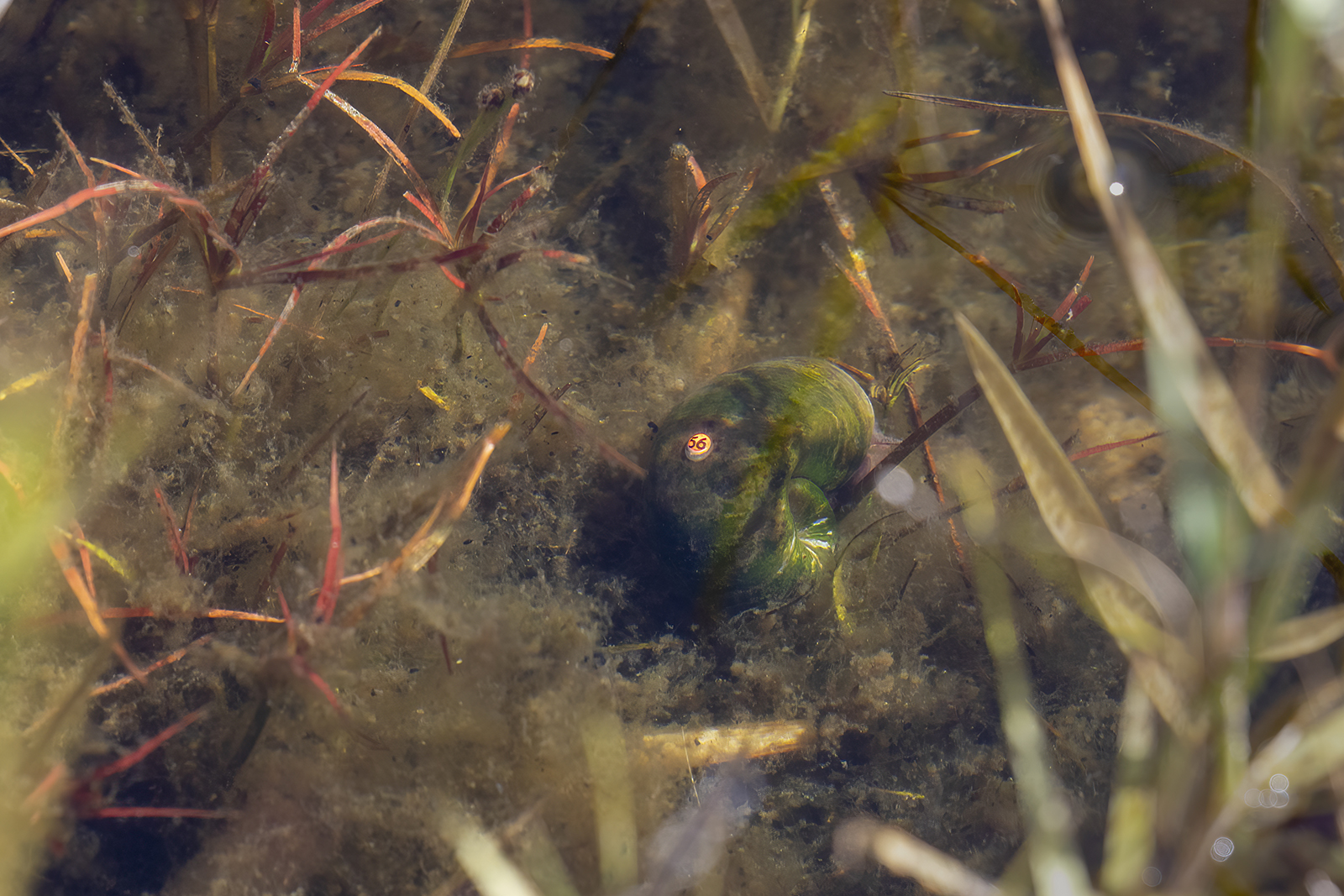 Recently released magnificent ramshorn snail in its new aquatic habitat