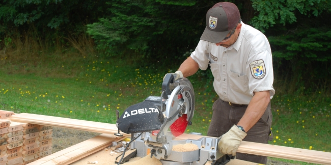 Quilcene National Fish Hatchery staff cutting lumber for maintenance project.