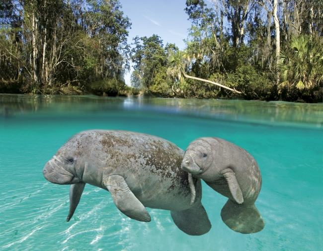 Manatees pose for the camera in the warm water springs of Three Sisters Springs, Florida.