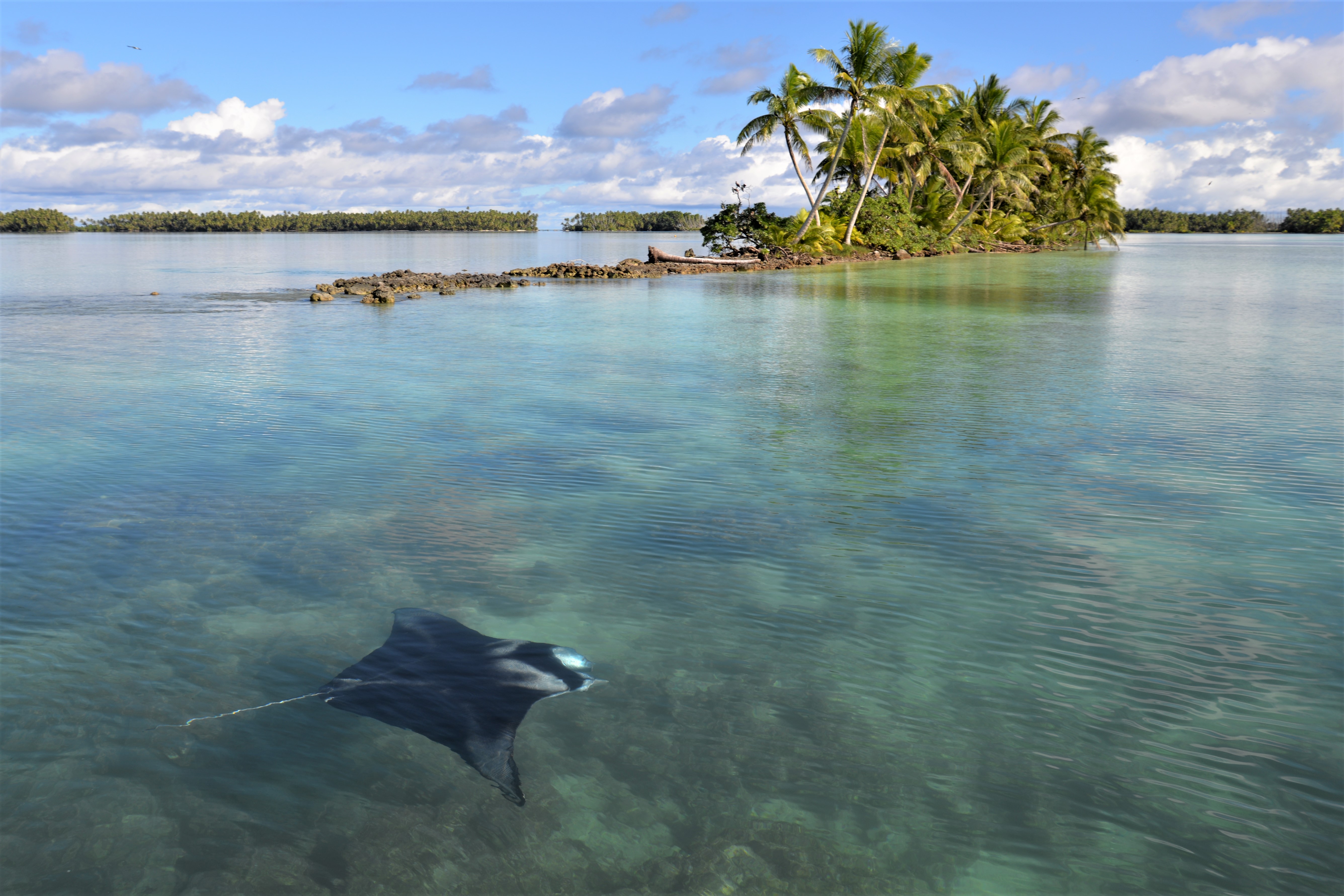 A manta ray swims by one of Palmyra Atoll's small islands, covered with palm trees soon to be restored with native species of plants