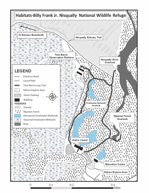 This map shows the habitats (identified using symbols for each habitat type) visible from the Twin Barns Loop Trail at Billy Frank Jr. Nisqually National Wildlife Refuge.