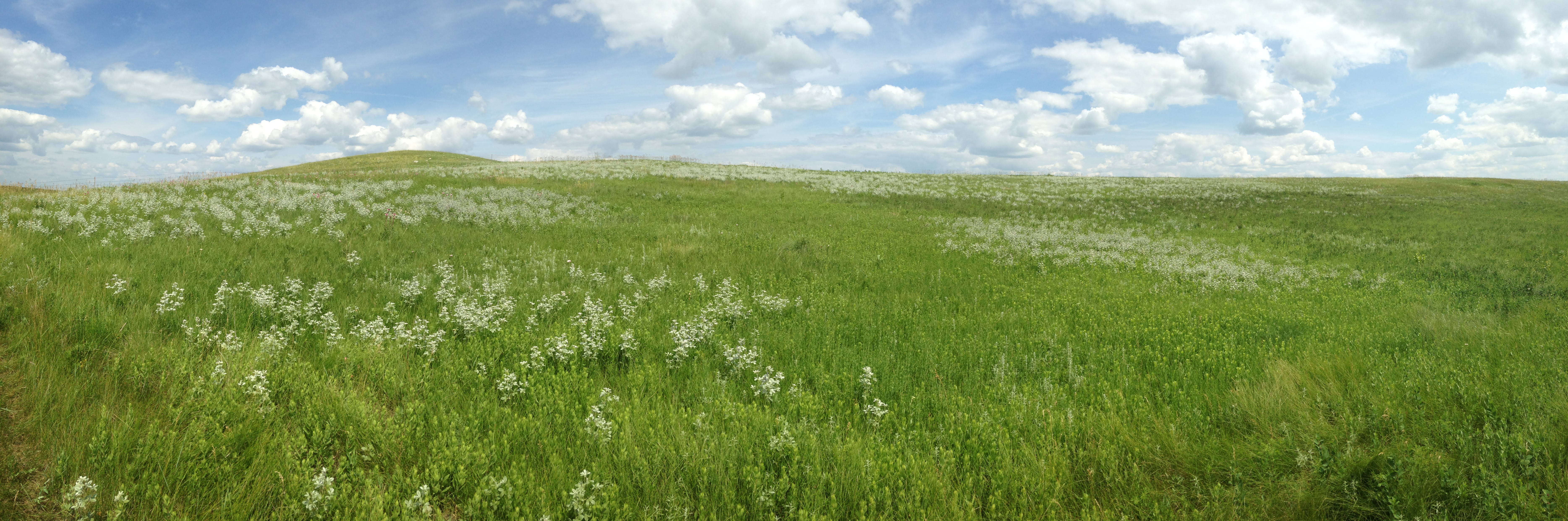 A beautiful panoramic view showing the lush green-up after the prescribed fire earlier in the spring. Silverleaf scurfpea is the sage/silver colored plant dotting the hillsides.