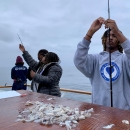 Michael Lazare, on the right, hooks squid bait. On the left, Program Director for the Blue Heart Foundation, Tammy Blevins, helps another youth hook bait (USFWS).