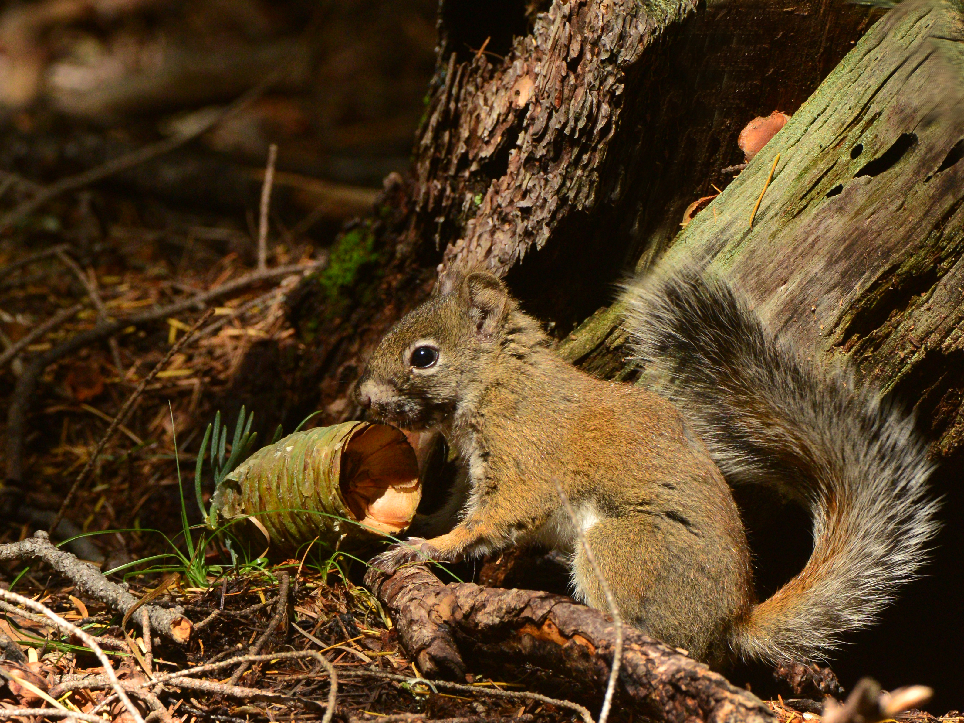 An endangered Mount Graham red squirrel sits on the forest floor .