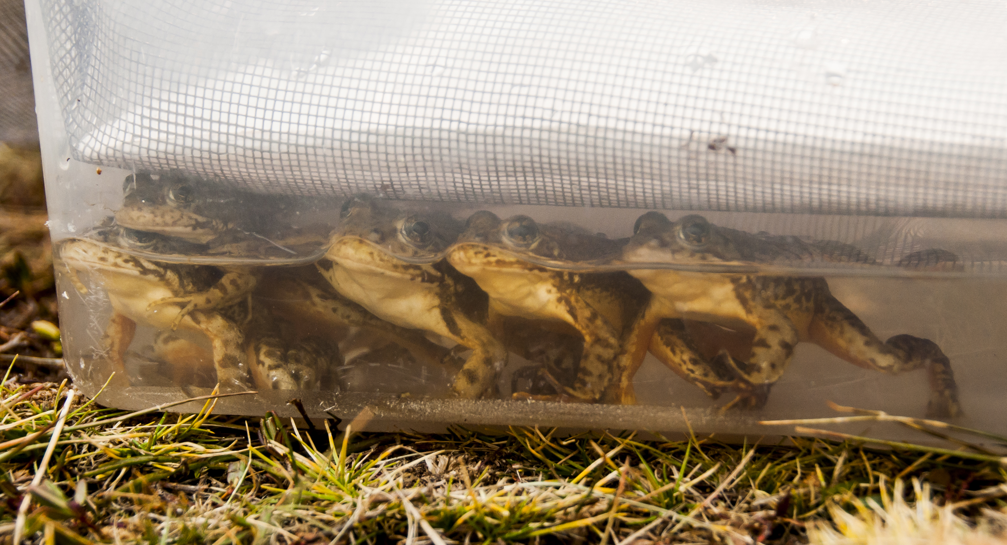 Mountain yellow-legged frogs soak in an antifungal treatment solution for approximately 10 minutes once a day for eight days. This treatment reduces the amount of fungus on the frogs’ skin, giving their immune systems an opportunity to catch-up and begin to fight the fungus naturally.