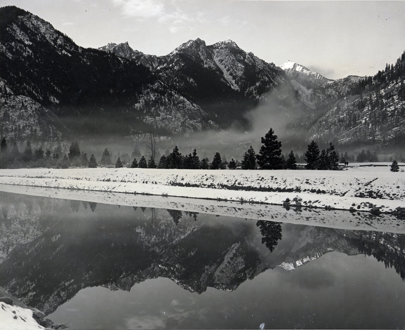 On a calm December day in 1940, the newly completed diversion channel at Leavenworth National Fish Hatchery reflected Sleeping Lady Mountain.