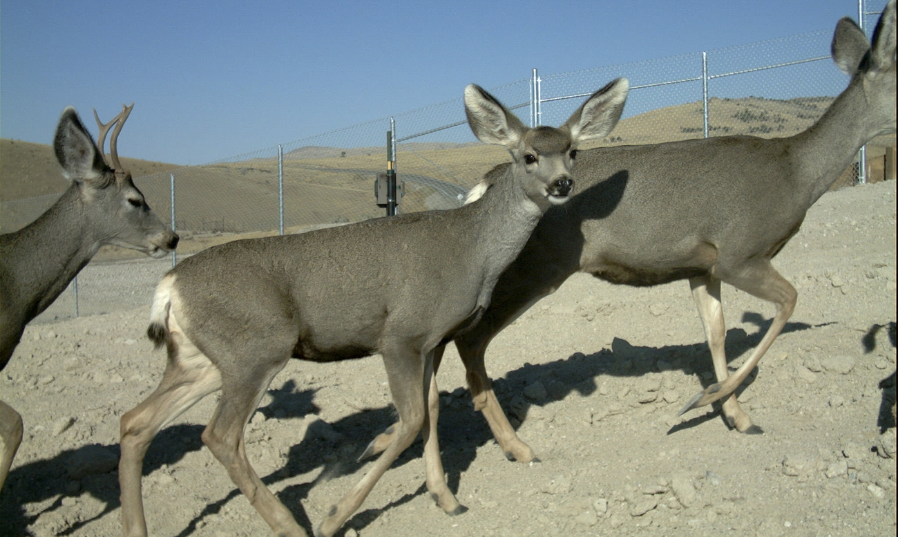 Mule deer use the recently constructed overpass along Highway 93, in Elko County. More than 35,000 mule deer crossed the overpass between Fall 2010 and Spring 2014, avoiding potential collisions with vehicles. Photo courtesy of NDOW