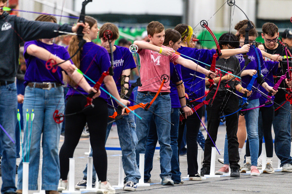 Archers take aim during the 2024 Nebraska National Archery in the Schools Program State Tournament at the Sandhills Global Event Center in Lincoln. March 16, 2024. Eric Fowler, Nebraskaland Magazine/Nebraska Game and Parks Commission.