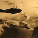 SDB from U.S.S. Yorktown approaching Wake Island where it will drop bombs on enemy installations.