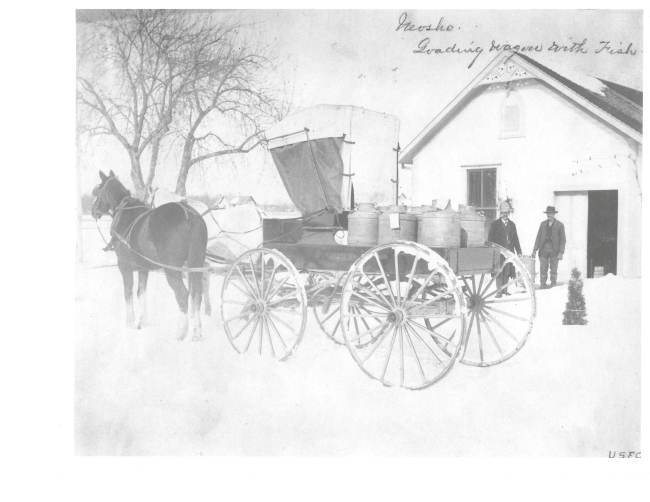 Picturesque way to move milk cans of fish in a horse-drawn wagon at Neosho National Fish Hatchery (Missouri). It is the oldest federal hatchery in operation and was established in 1888.