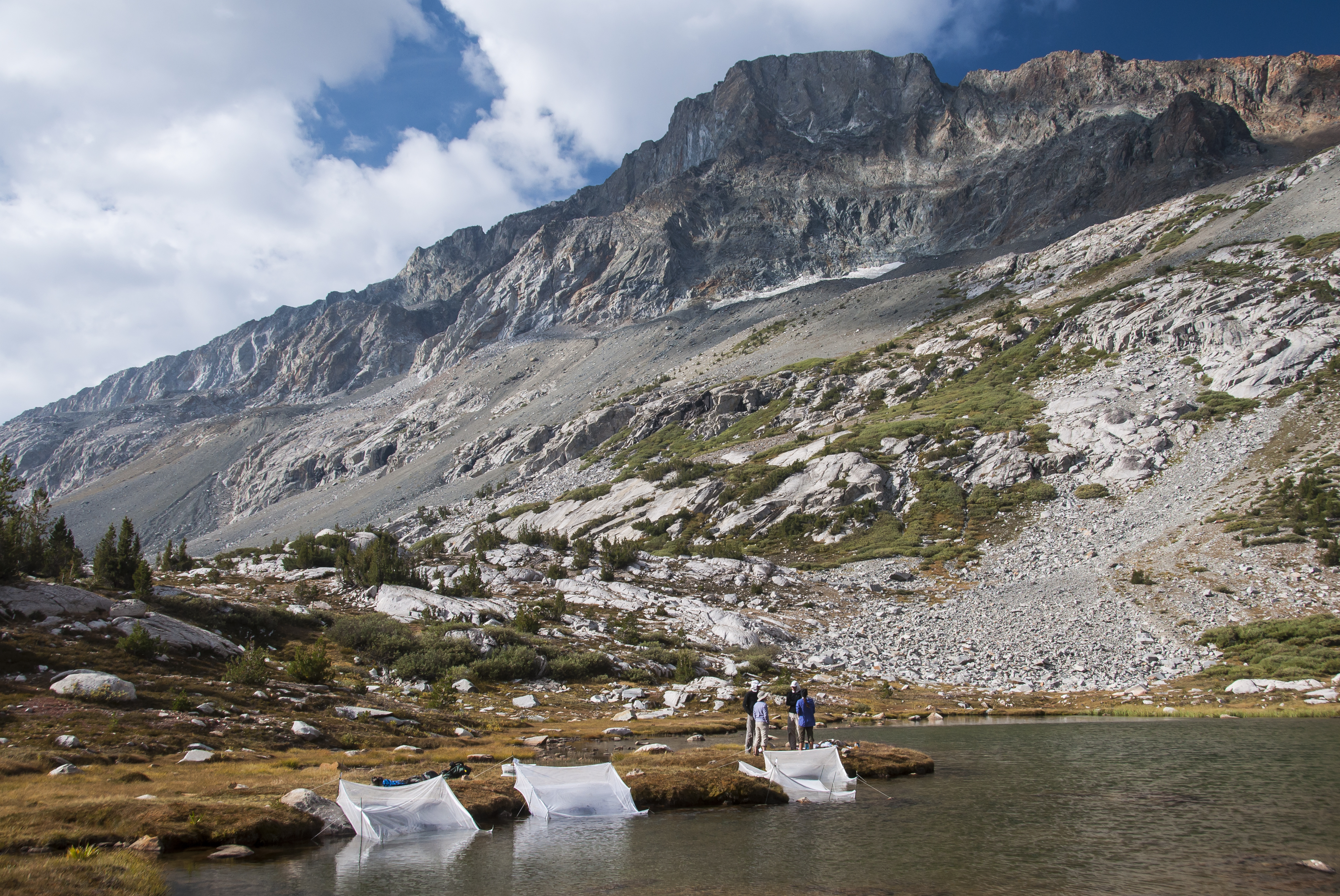 Biologists working to treat sick frogs in a remote lake have an on-site meeting to discuss the outcome of the day’s activities and next steps.