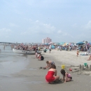 Scene of a busy New Jersey beach in summer with many people recreating; a tall building and a pier in the background.