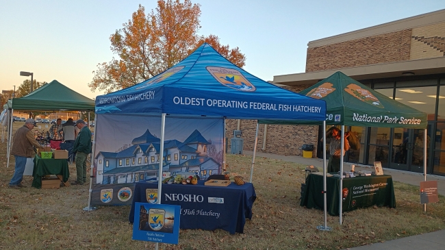 The annual meeting of the New Mac Electric Coop was held at Crowder College in Neosho. The Hatchery was set up next to our partner George Washington Carver National Monument, and we together represented the Department of the Interior to over 700 local residents.