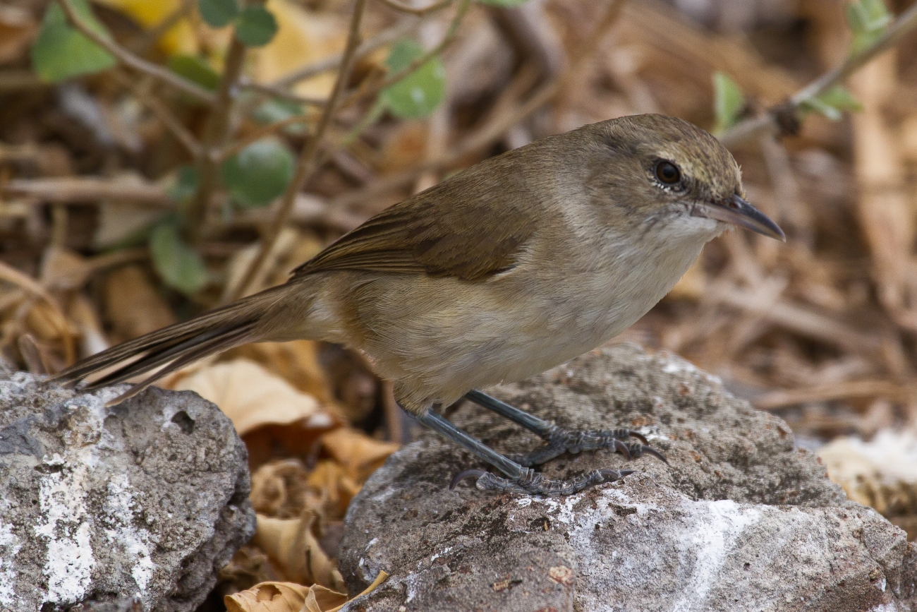 A Nihoa Millerbird / ulūlu (Acrocephalus familiaris kingi) rests on a rock amongst the ground cover on Nihoa Island.