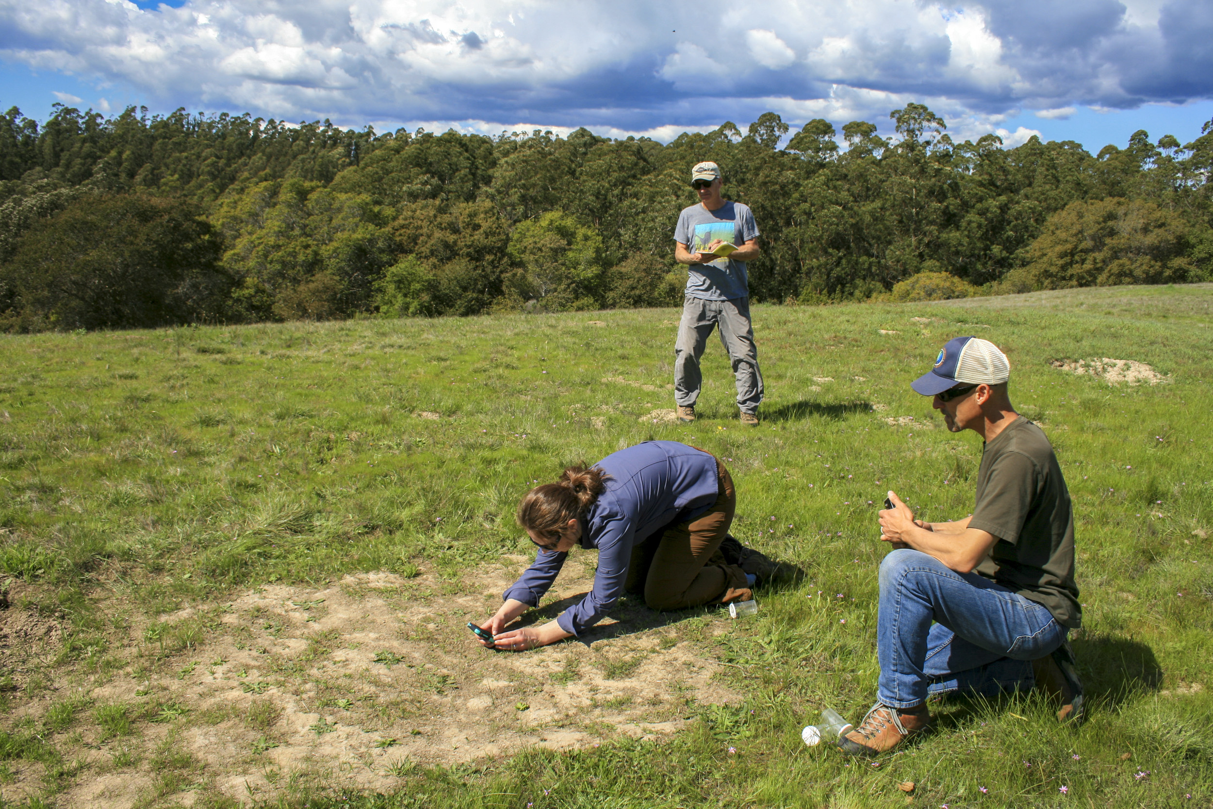 Tara Cornelisse (kneeling) releases an endangered Ohlone tiger beetle at a preserve near Soquel while Matt Timmer and Mark Allaback observe.