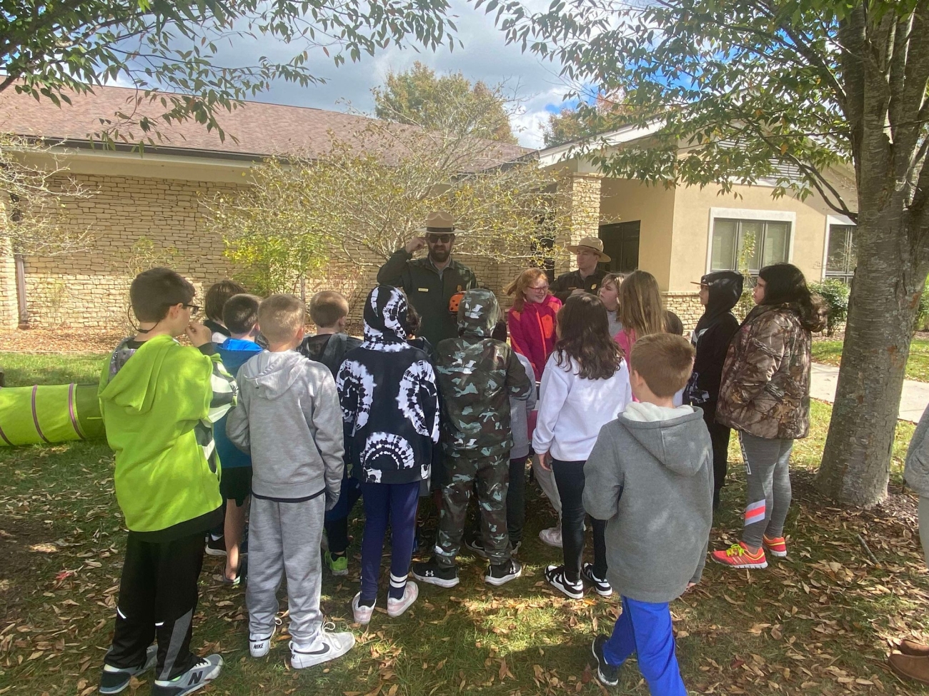 Students at the 2024 Outdoor Adventure Day at Wolf Creek National Fish Hatchery learning about Mammoth Cave.