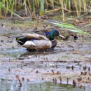 A pair of mallards feed on exposed aquatic vegetation along the edge of a freshwater marsh.