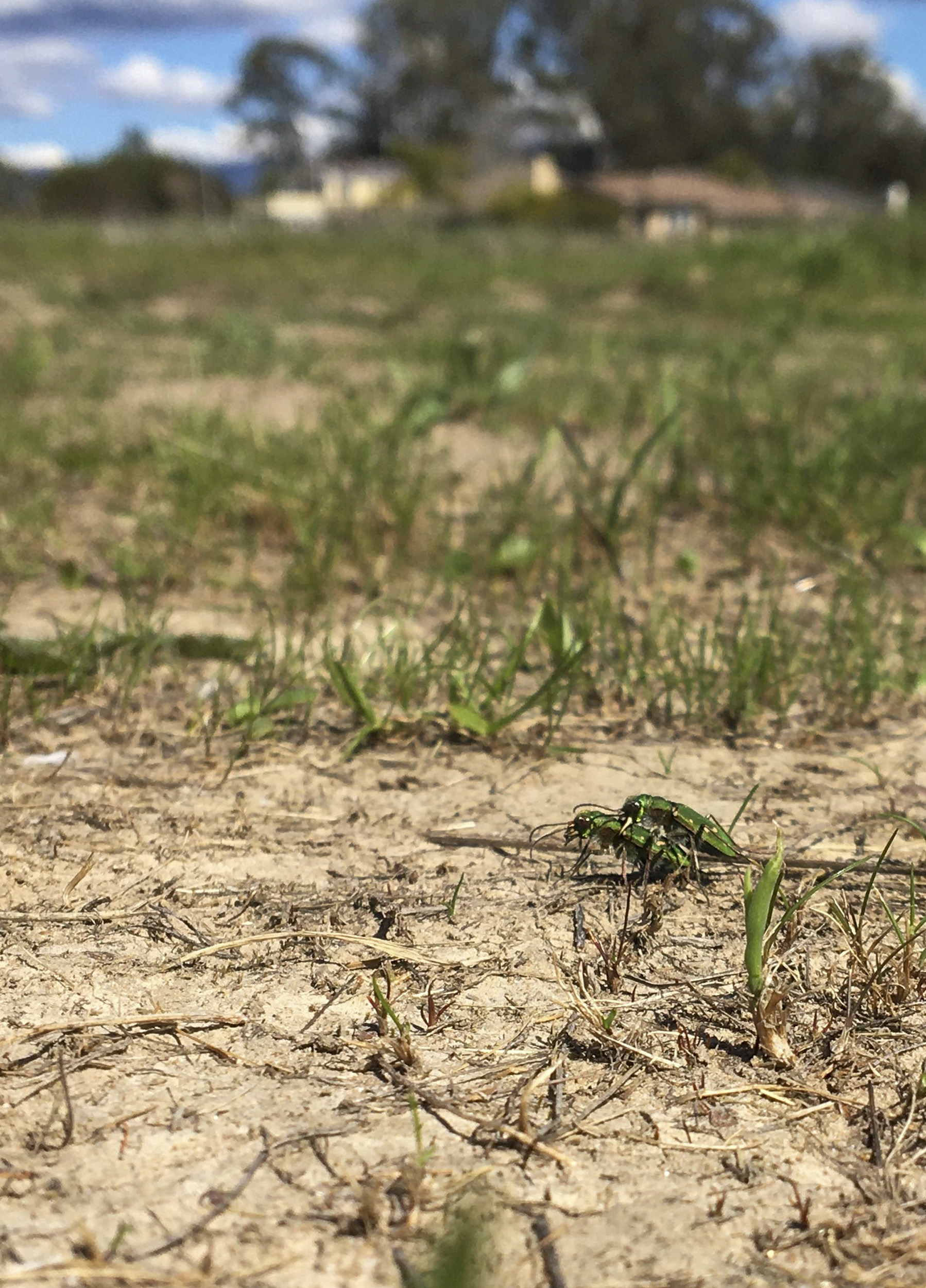 An Ohlone tiger beetle pair are observed mating at their new home at a preserve near Soquel, California, in the hours following their translocation. This is a promising sign for the long-term success of the translocation project.