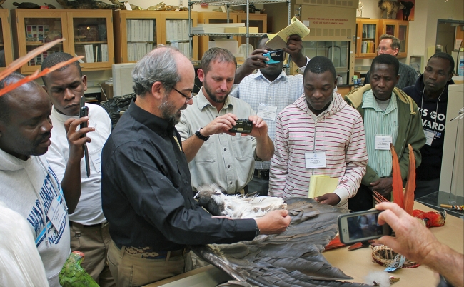 Dr. Pepper Trail explains his initial evaluation process to a group of African delegates visiting the wildlife forensics lab in Ashland, Oregon. Trail is known world-wide for his expertise in bird identification and often assists other countries in investigating black market trafficking of protected and endangered birds. Credit: Pepper Trail/USFWS