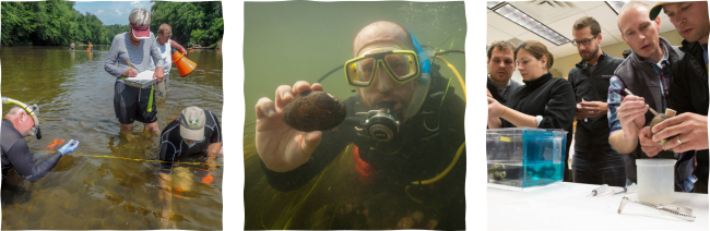The National Conservation Training Center provides a series of courses on freshwater mussels including Conservation Biology of Freshwater Mussels, Freshwater Mussel Propagation for Restoration, and Freshwater Mussel Identification educating conservation biologists to help restore declining populations and prevent extinction. Photo Credit: Ryan Hagerty/USFWS