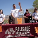 Palisade High School teacher Patrick Steele gives a speech next to his hatchery students.