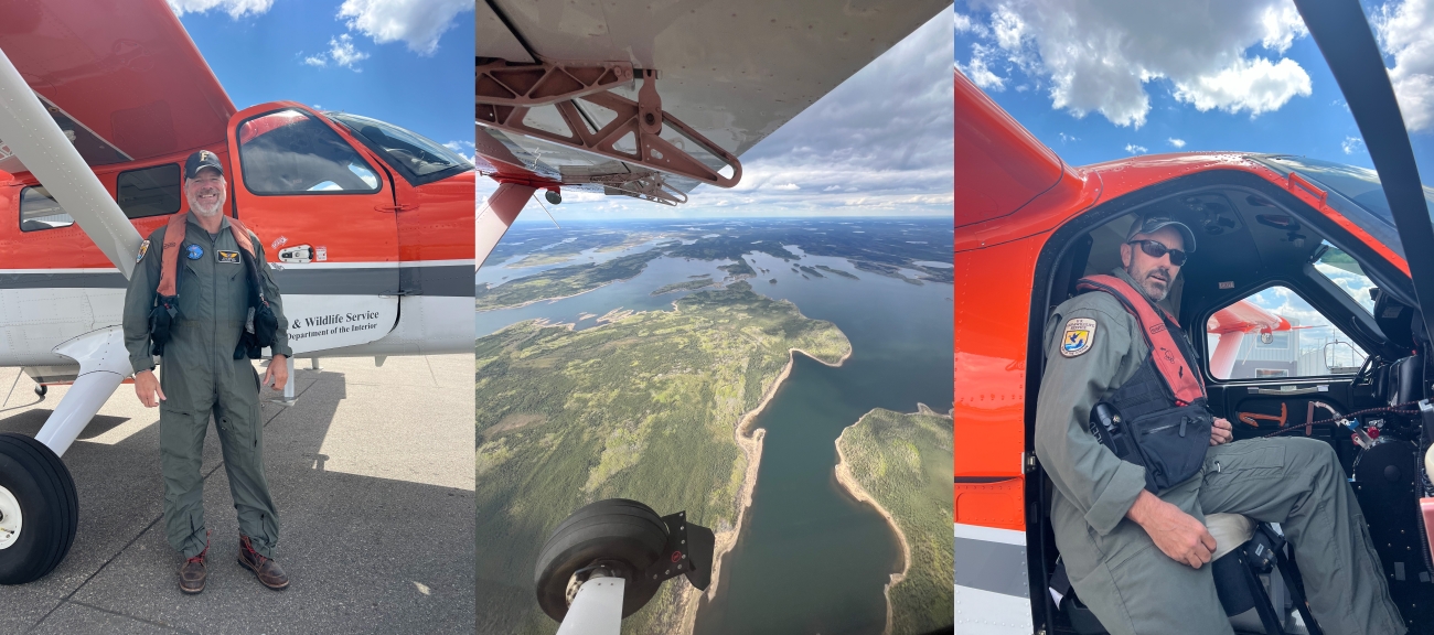 Steve Barlow (left) is the pilot biologist for the northern Saskatchewan and Manitoba survey crew. Chris Cain (right) gets into the airplane to survey, and they both see a vast system of wetlands and forests in northern Saskatchewan (middle), This image was taken during the 2024 Waterfowl Population and Habitat Survey.