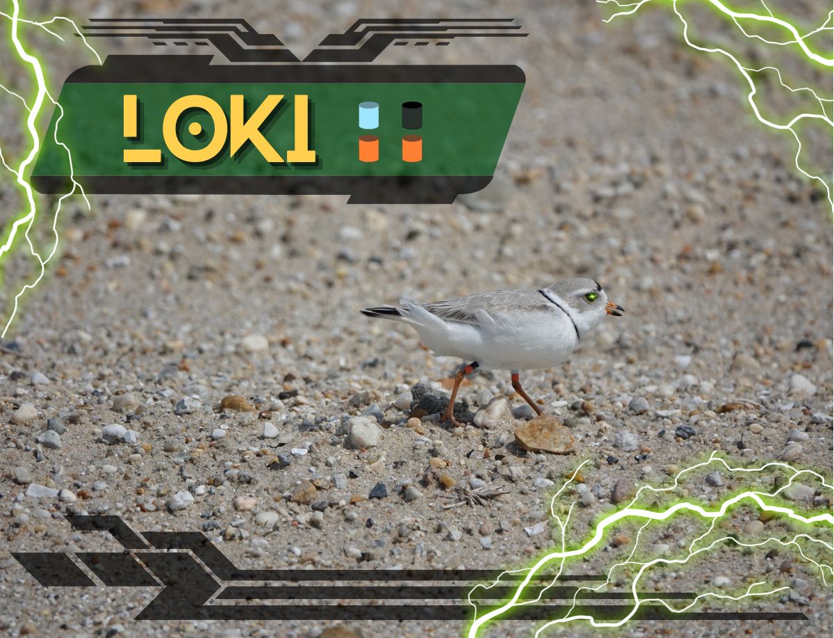 A piping plover facing right on a sand and gravel beach. His eye has a green sparkle in it. Black graphics and green lightning frame the image. The dark green and black nameplate contains stylized yellow text that reads, “Loki”. Colored cylinders representing the plover’s color band combination are next to the text and show light blue over orange on the left and black over orange on the right.