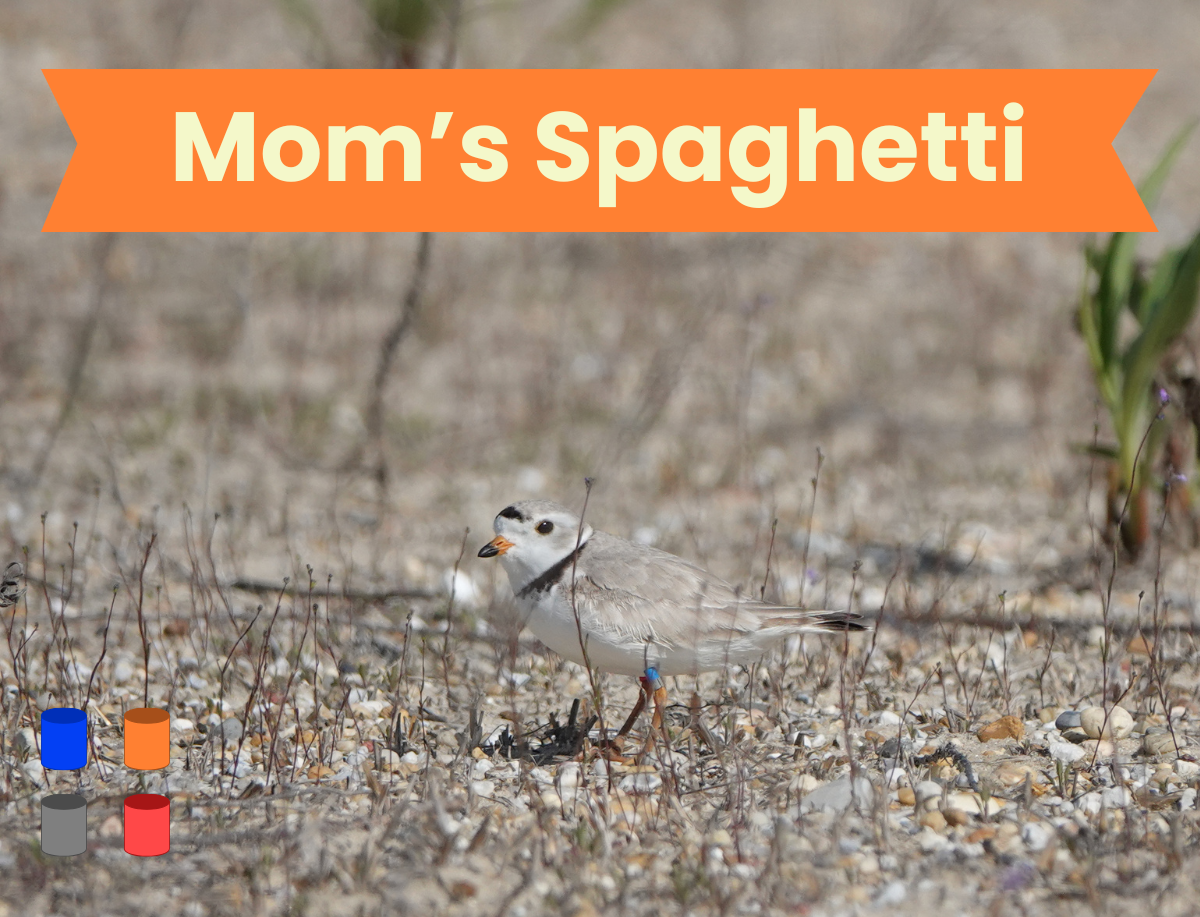 A small, sandy-colored shorebird with an orange and black bill and a black headband and neck collar stands on a gravel and sand beach among some small, sparse vegetation. Four cylinders representing the color band combination on its legs are in the lower left of the photo and are read as cobalt over gray on the left and orange over red on the right. The orange banner along the top reads “Mom’s Spaghetti” in light yellow text.