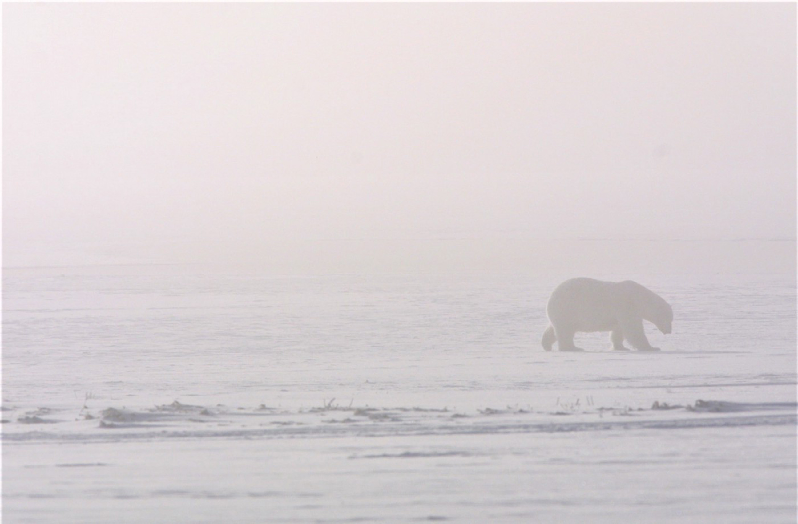 A polar bear moves through ice fog at Arctic National Wildlife Refuge in Alaska.