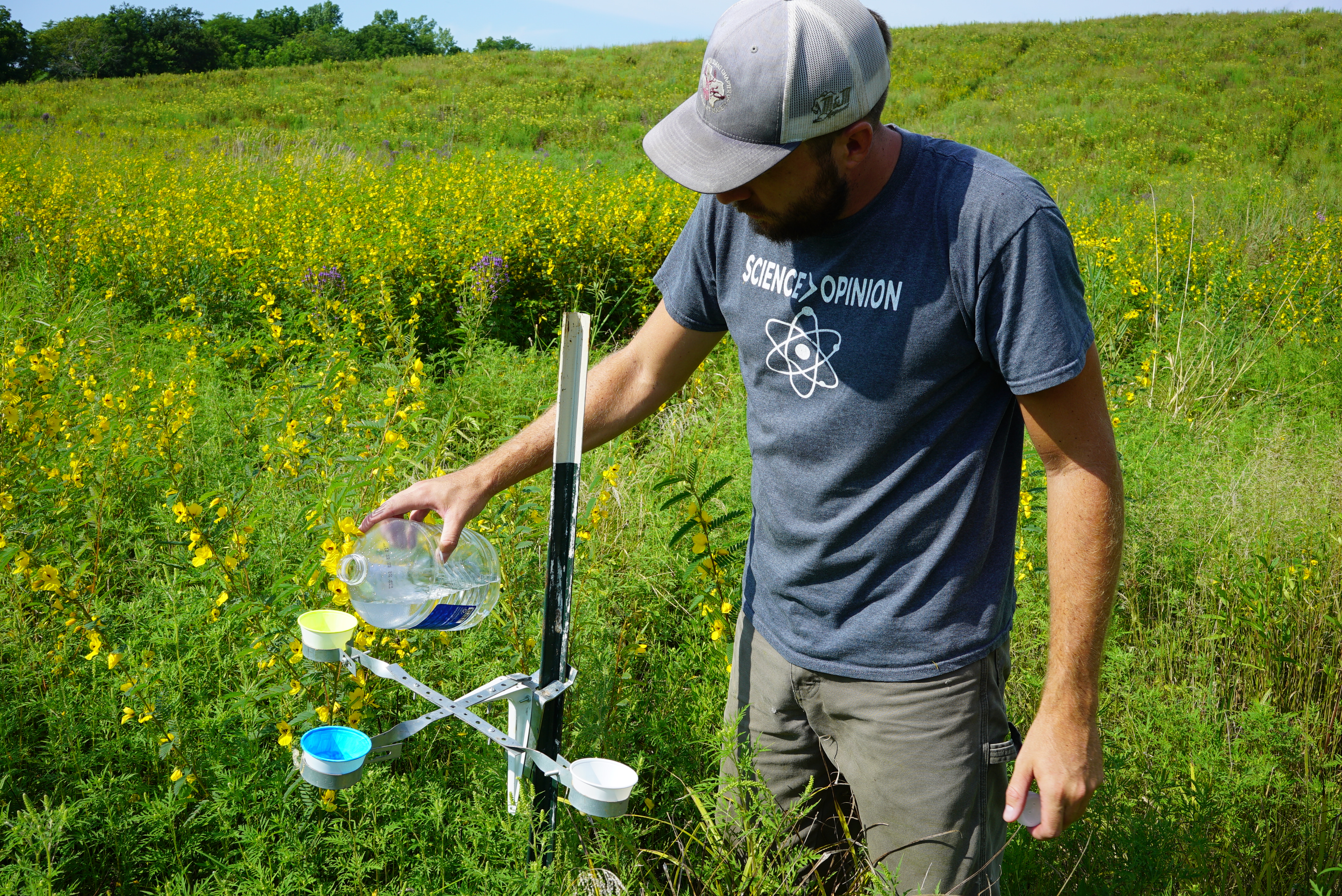 These bee bowl traps were used to assess the diversity of pollinators in the restored grasslands seeded with low- and high-diversity seed mixes.