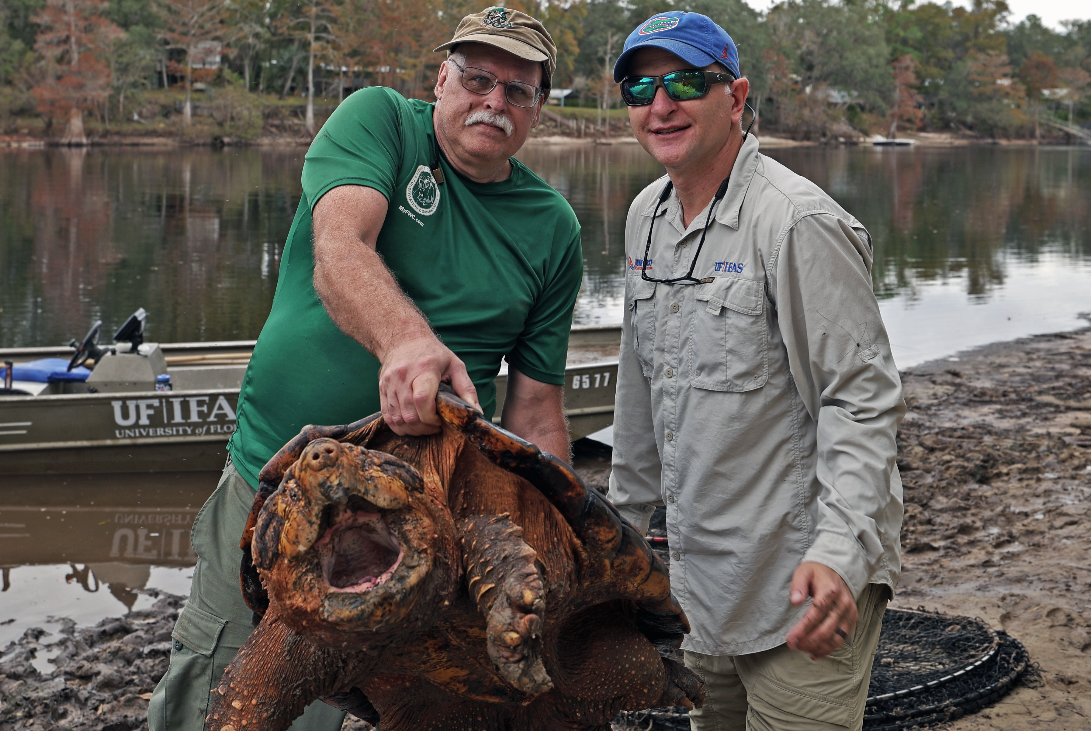 Kevin Enge, left, FWC, and Travis Thomas, UF, right, pose while holding a large male Suwannee alligator snapping turtle. This is the 15th year the two men have been trapping and monitoring the Suwannee alligator snapping turtle to conserve and protect them.