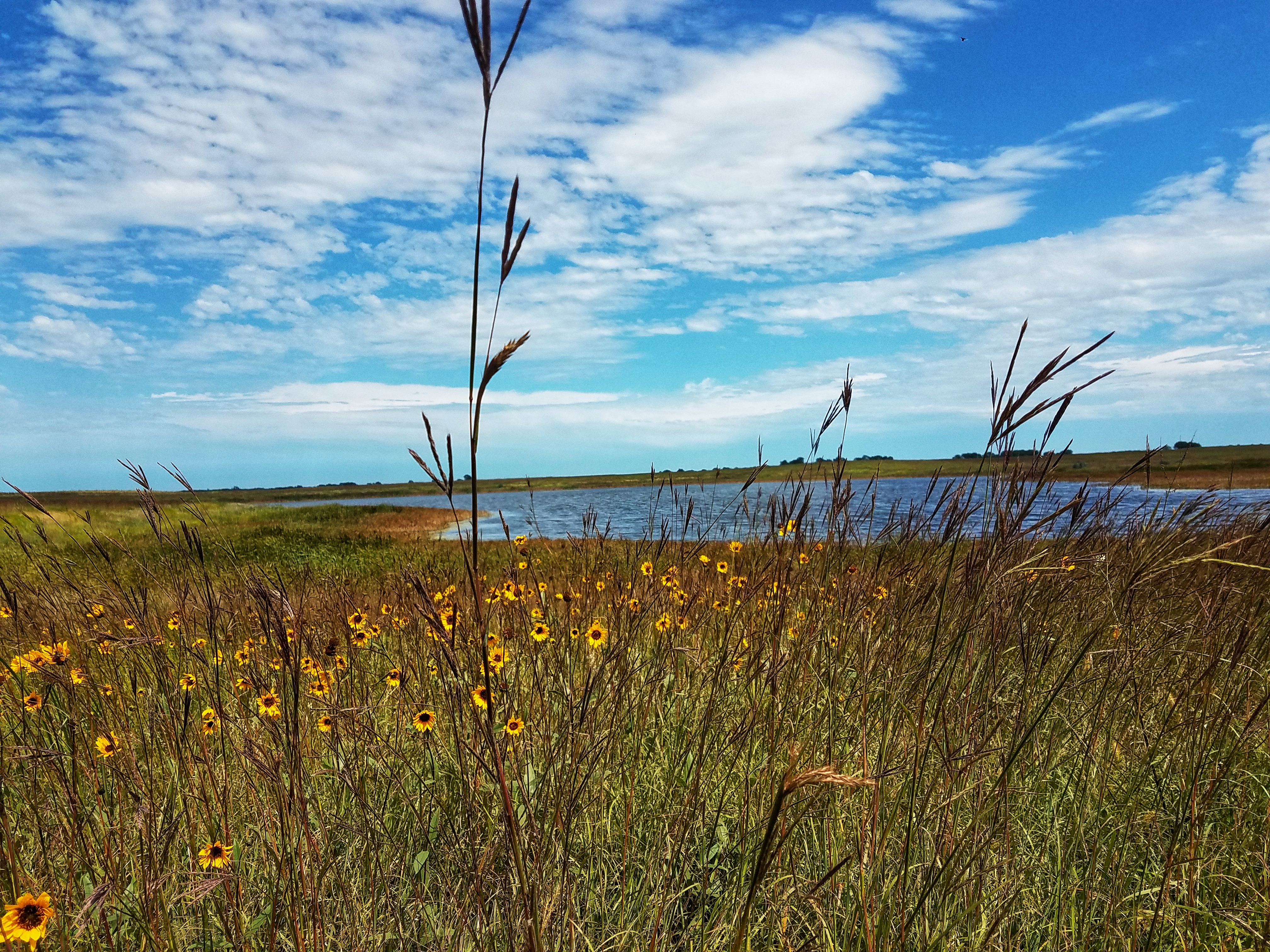 Big blue stem with wildflowers near a prairie pothole. Native vegetation and prairie pothole ponds make a great combination for breeding ducks.