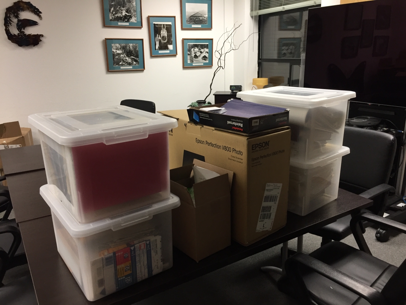 Totes and boxes of files and photos and a scanner sit ready for pickup.