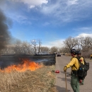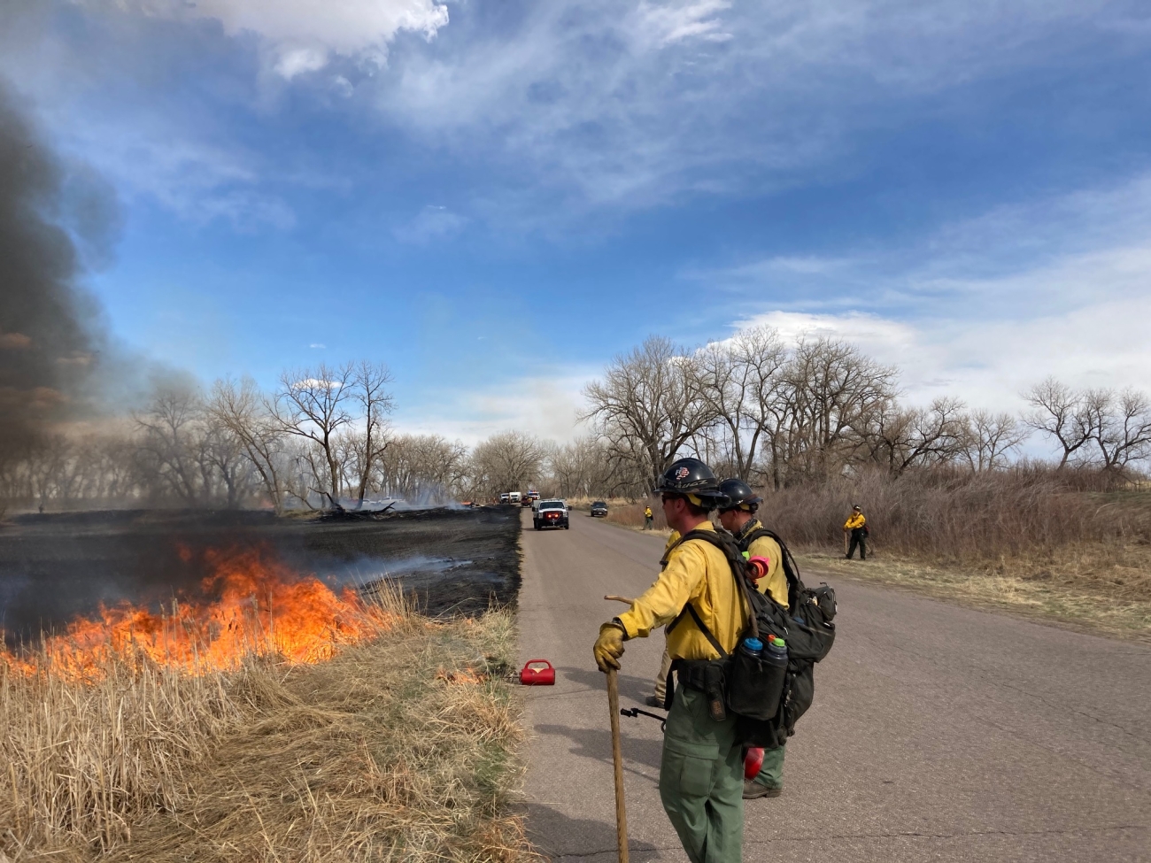 Two firefighters from the the Wildland Support Module monitor a prescribed burn at the Rocky Mountain Arsenal National Wildlife Refuge.