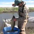Invasive common carp have had a devastating effect on Malheur Lake, degrading water quality and reducing the quantity and quality of food and habitat for many bird species. Here, an Abernathy FTC biologist weighs a common carp to be used for an experiment to test whether electrofishing technology can be used to reduce carp populations.