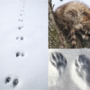 Clockwise from top right: A raccoon at Missisquoi National Wildlife Refuge in Vermont; a set of raccoon prints at Missisquoi Refuge; a trail of raccoon tracks at Missisquoi Refuge.