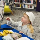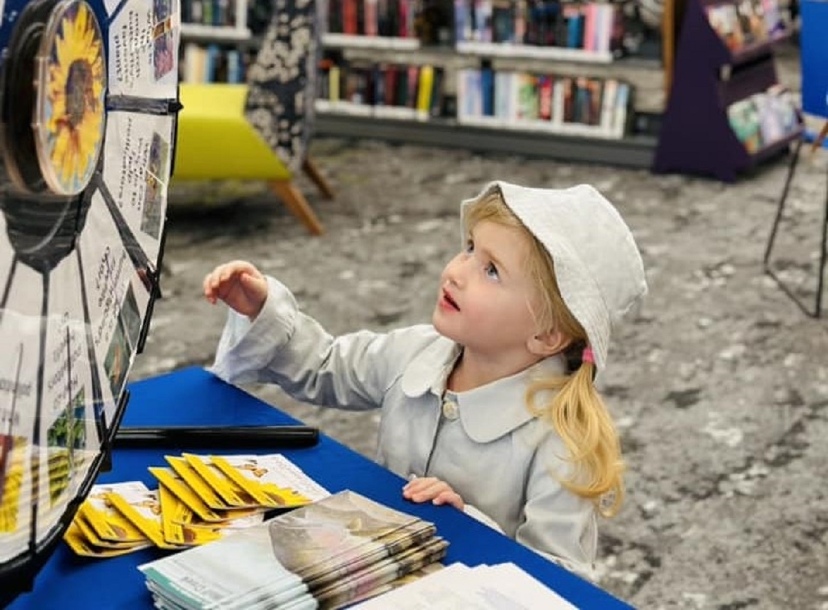 This little girl is enjoying spinning the wheel to learn about pollinators.