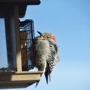 A red-bellied woodpecker fluffs her feathers and visits a suet feeder to stay warm on a cold day.