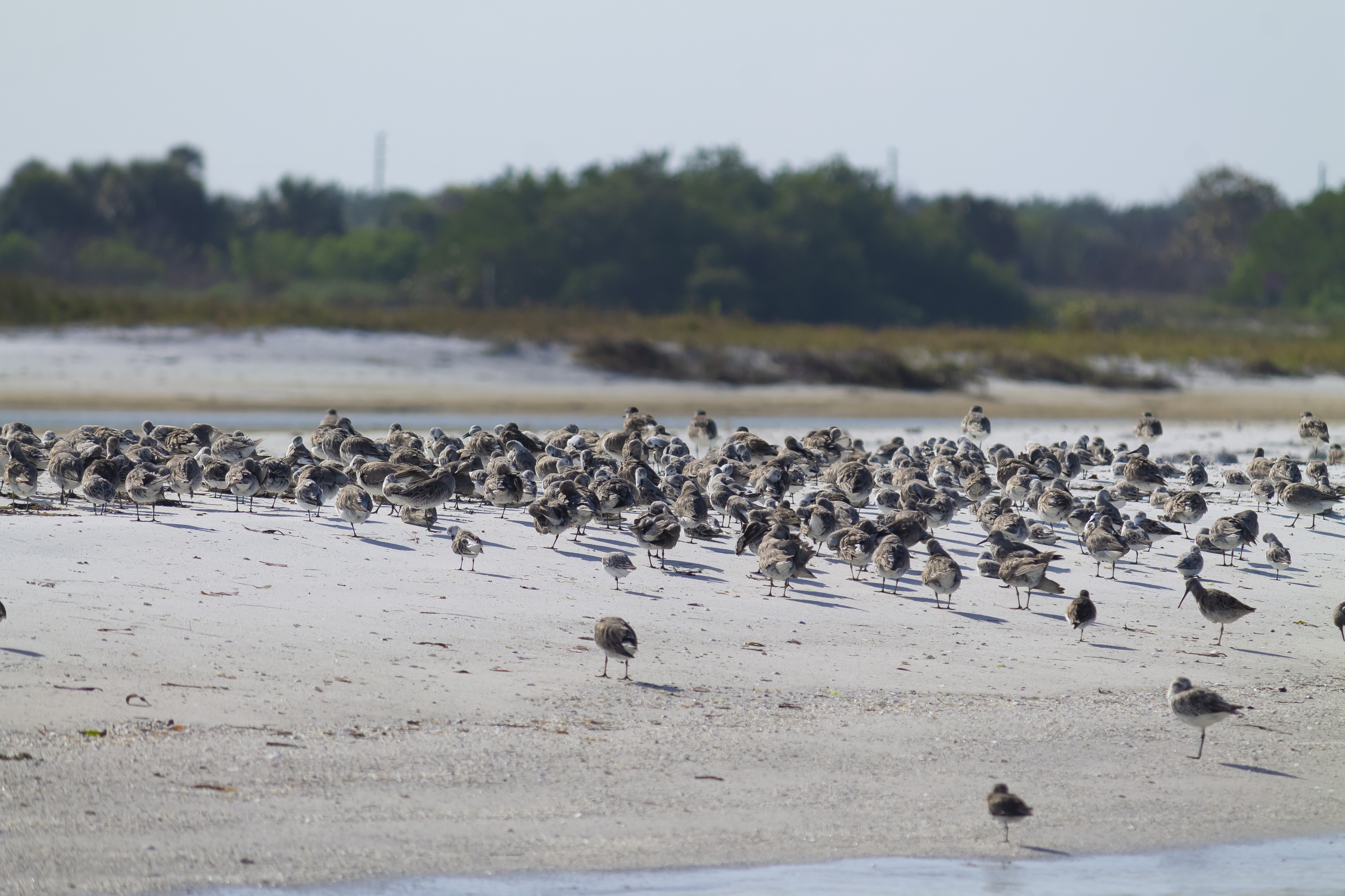 A flock of red knots on a beach shows how difficult it can be to read flags. Transmitters provide important insight when reading bands is difficult.