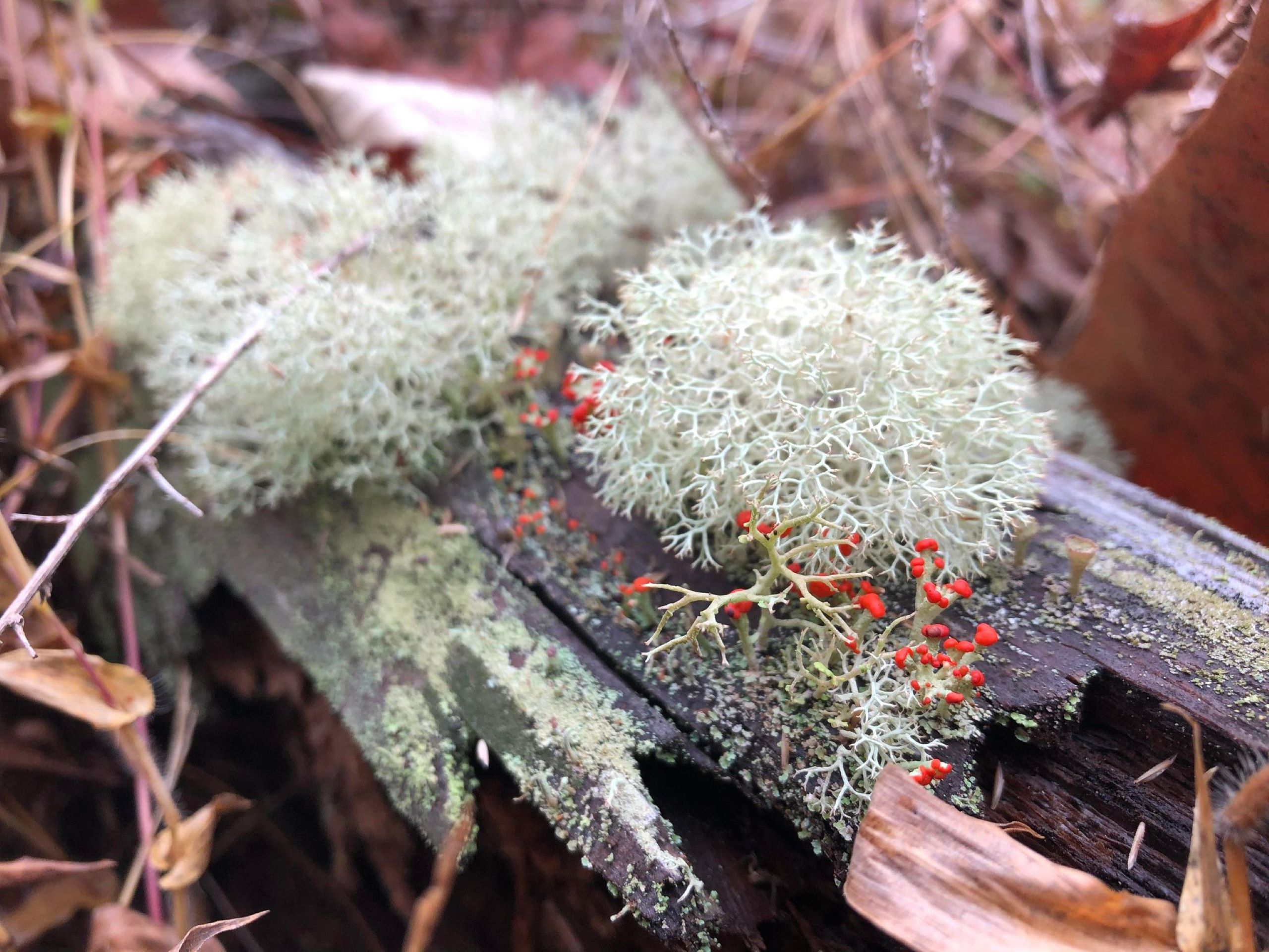 Reindeer moss (lichen) and British Soldier lichen growing on a log at the bank of Wolf Creek National Fish Hatchery's Hatchery Creek.