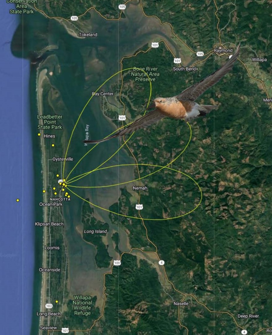 Picture of a map showing triangulation of red knot movement from a Motus tower in Oregon