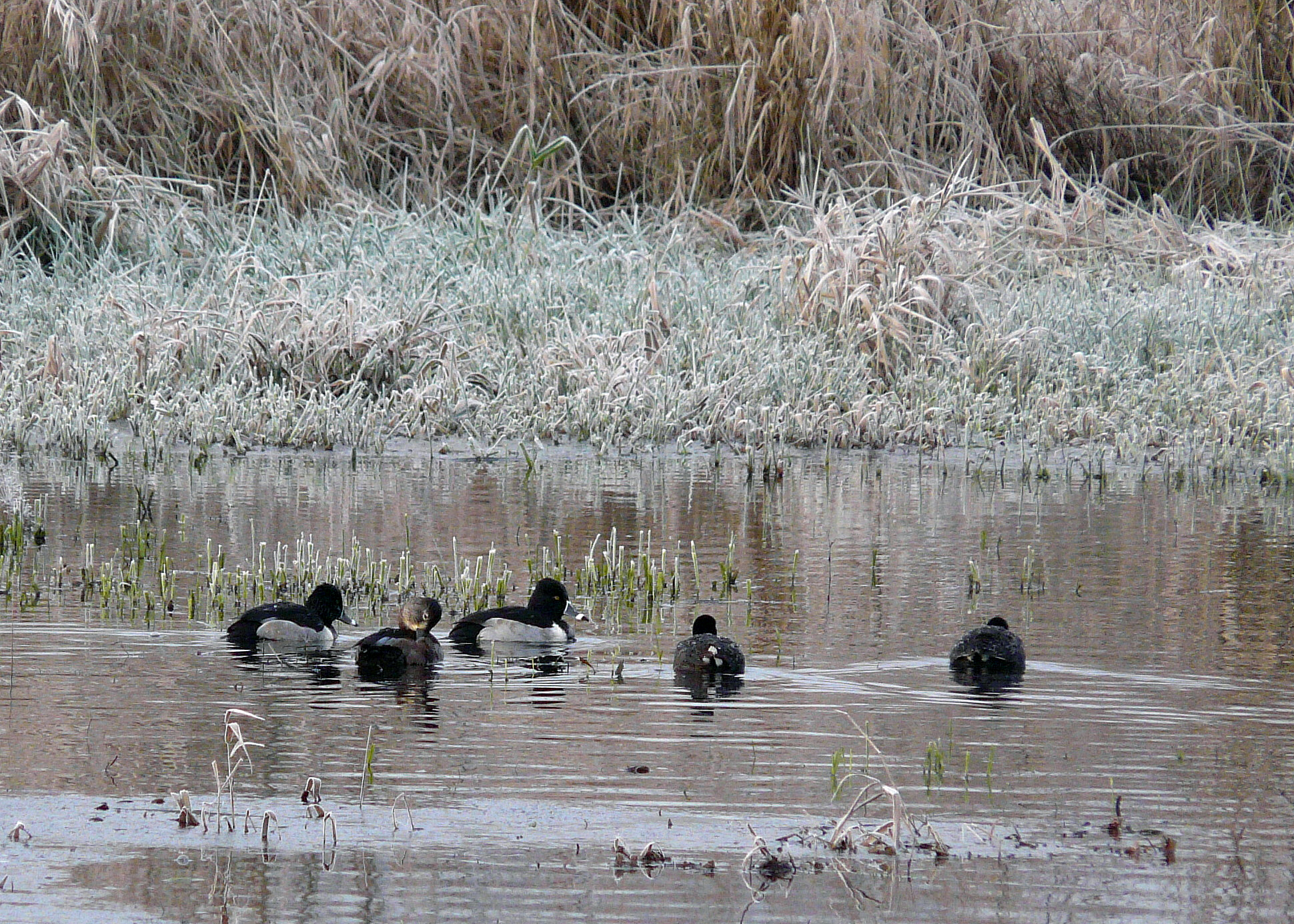 Ring-necked ducks on a frosty day