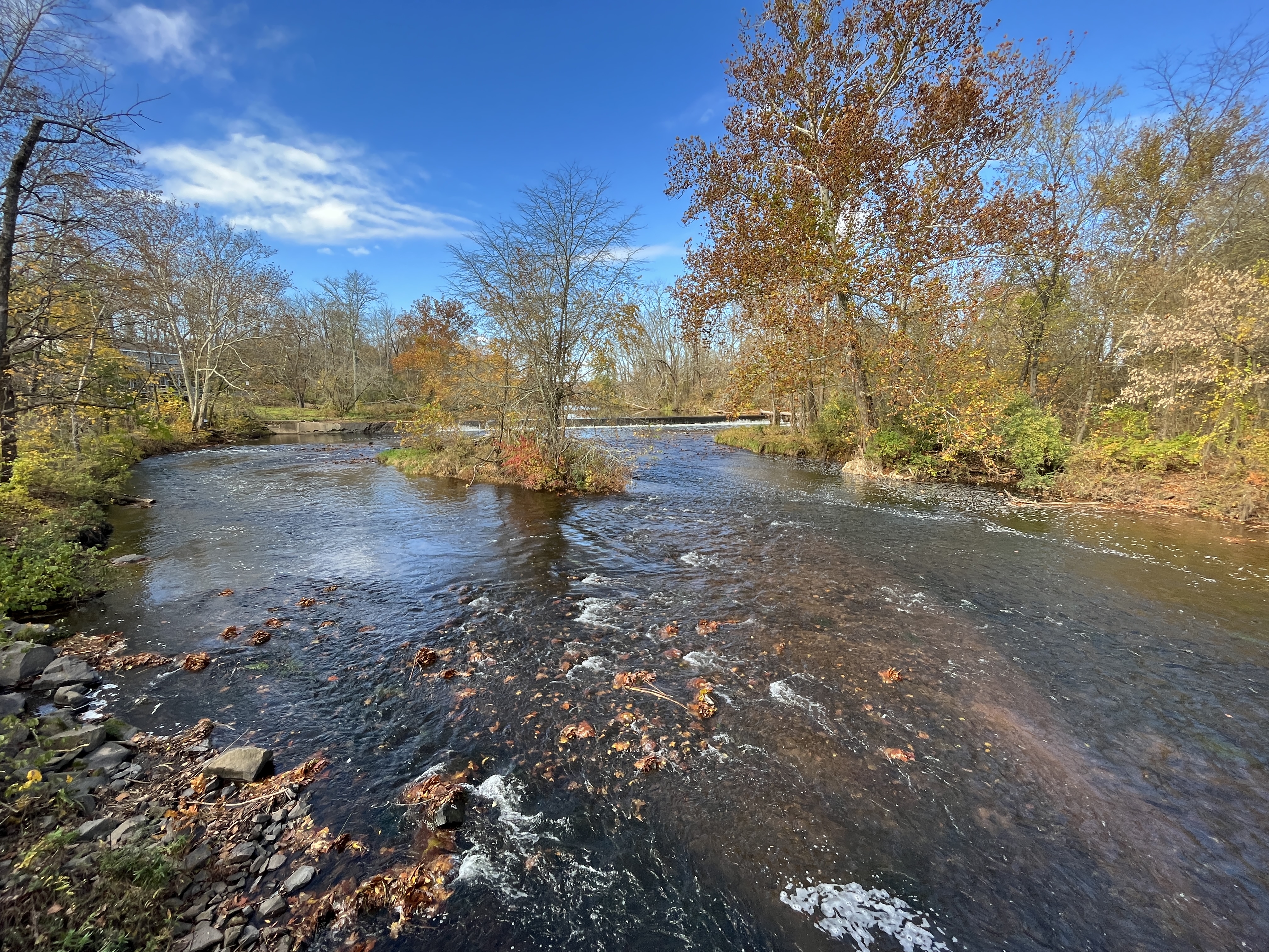 An upstream view of the Rockafellows Mills Dam on the South Branch of the Raritan River in New Jersey.