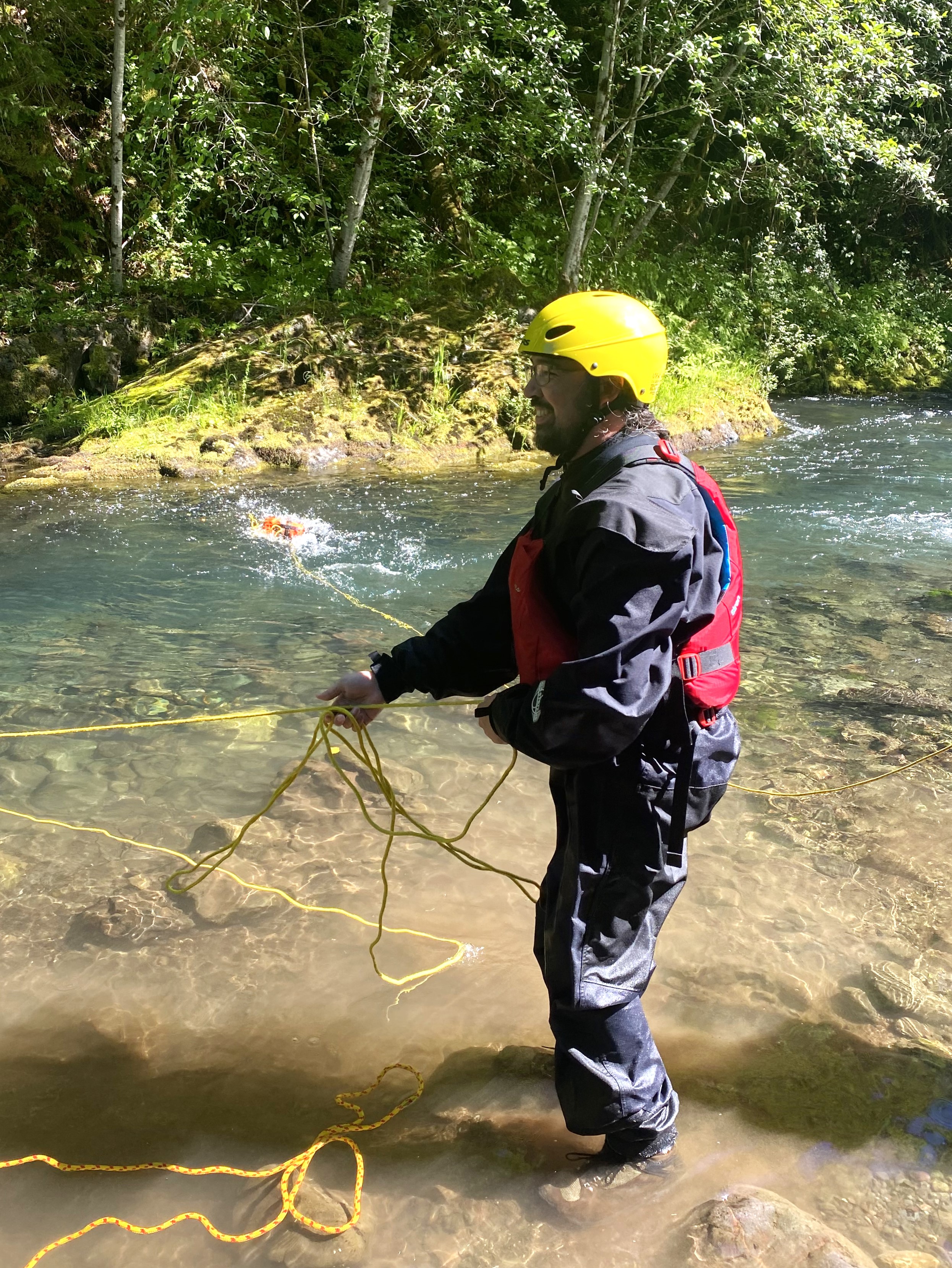 Bureau of Indian Affairs intern Chris Lage practices with a throw bag during Swiftwater rescue training.